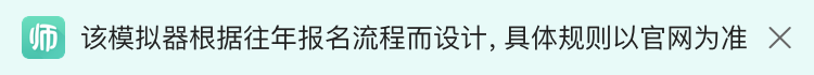 本次教师资格证报名模拟器仅为模拟全国教师资格证报名流程,并不保证与正式报名场景一致,一切以正式报名场景及正式报名结果为准;